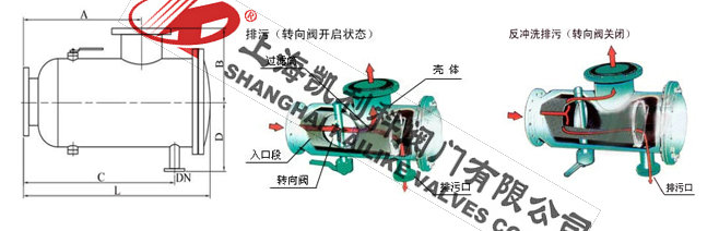 手動蝶閥開啟,即閥板平面與筒體軸線平行,(此時扳手亦與筒體軸線平行)排污閥關閉。此時水流從進口直接進入過濾網筒內部,經濾網過濾后由出口排出。